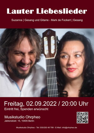 Schon lange singt Suzanna über die Liebe. Bis jetzt war das eine einseitige Geschichte. Bis sie ihren jetzigen Partner fand. Als sie herausfand, dass er auch noch singen kann, hat sie ihn auf die Bühne geholt. Zusammen machen sie ein Programm, worin die Freude, aber auch das Leiden, welche die Liebe mit sich bring in voller Schönheit, aber auch mit Humor zum Ausdruck kommt. Suzanna spielt an der Gitarre und singt mit Mark de Fockert.